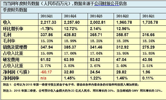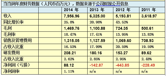 我們再看一下公司的業(yè)績表現,以下表格是當當網的相關歷史財務數據,從中可發(fā)現幾個比較顯著的特征: -這是一家業(yè)務比較穩(wěn)健的公司,各項比率在不同會計期間都比較不亂; -公司的業(yè)務也呈現穩(wěn)步增長的態(tài)勢; -2014年是第一年泛起全年盈利年份,主要仍是得益于規(guī)模的增長; -2015年第一季度重大虧損,主要由于電子書、移動和內容業(yè)務的投入導致毛利下滑; 假如從資產負債角度看,截止2015年3月31日確當當網總資產約46億元人民幣,凈資產約6億元人民幣,現金及等價物(含短期投資)余額約為16.4億元人民幣,資產負債率接近87%,但資產的質量仍是不錯的, 以活動資產為主。但因為凈資產總量偏低(近6億多人民幣),假如采取激進經營戰(zhàn)略又無法盈利的情況下,可能會導致凈資產為負數,因此穩(wěn)健的經營戰(zhàn)略是個現實的選擇。但可能正由于如斯,假如不考慮并購的整合效應,當當網的估值也會受一定程度的到負面影響。 從現金流角度看,2014年和2013年連續(xù)兩年的經營流動現金流都是正數,分別為2.65億和2.73億元人民幣。 所以從歷史數據來看,可以預計2015年當當網的收入規(guī)模會突破100億元人民幣的規(guī)模,基于公司歷史的穩(wěn)健經營風格和治理層在最新季度業(yè)績公告上所宣稱的對將來業(yè)績頗為樂觀,其業(yè)績猜測和估值水平到底應該是多少才是公道和公允?
