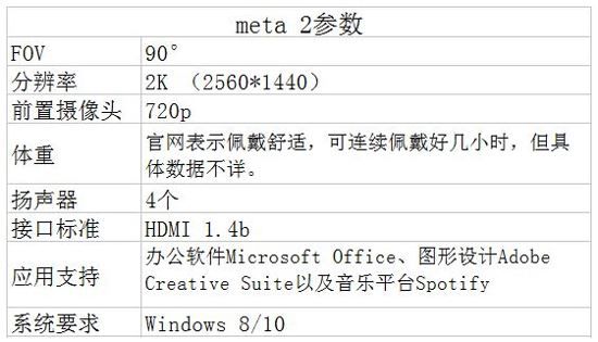 固然AR界老大哥微軟的HoloLens已經(jīng)開始預售,但同為AR界的另一家美國初創(chuàng)公司Meta也提前發(fā)售了旗下的AR產(chǎn)品——Meta 2。 和HoloLens一樣,Meta 2是一款增強現(xiàn)實眼鏡,戴上它就能夠在你的真實視野里疊加虛擬影像。 參數(shù)方面,Meta 2擁有90度的半透明視野,比HoloLens的視場角要大,二代的投射屏幕分辨率為2560x1440,比擬一代有很大晉升。