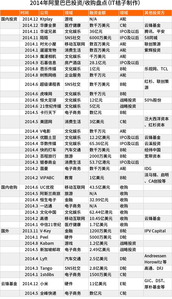 ![]() 2014年的海內(nèi)互聯(lián)網(wǎng)創(chuàng)業(yè)投資空前火熱、互聯(lián)網(wǎng)的巨頭們布局也如火如荼,一方面是自營業(yè)務(wù)的不斷擴(kuò)張,各類平臺各種新產(chǎn)品,一方面是大手筆的投資和并購,從海內(nèi)到國外,幾乎分布在各個(gè)行業(yè),讓整個(gè)2014年的海內(nèi)互聯(lián)網(wǎng)版圖風(fēng)云變幻。 IT桔子(itjuzi.com)是一家關(guān)注中國IT互聯(lián)網(wǎng)創(chuàng)業(yè)投資的數(shù)據(jù)庫和貿(mào)易信息服務(wù)提供商,最近發(fā)布了《2014年度中國互聯(lián)網(wǎng)創(chuàng)業(yè)投資清點(diǎn)》,用數(shù)據(jù)和觀點(diǎn)清點(diǎn)2014年海內(nèi)互聯(lián)網(wǎng)創(chuàng)業(yè)、投資、至公司格式、上市、失敗等全方位的信息。 以下是清點(diǎn)內(nèi)容: 一、阿里巴巴 王者加冕,2014年9月19日,阿里巴巴正式上市,造就美股最大IPO的歷史記實(shí)之外,也是其一場盛大的成人禮。 從電子商務(wù)出發(fā),阿里巴巴打造了一個(gè)很大的貿(mào)易生態(tài)系統(tǒng),通過自有業(yè)務(wù)、資本手段,構(gòu)建著一個(gè)龐大且具備相互協(xié)作遠(yuǎn)景的貿(mào)易大版圖。在這張版圖中,阿里巴巴的“互聯(lián)網(wǎng)帝國”囊括了電子商務(wù)、金融、本地糊口O2O、教育、旅游、汽車、房產(chǎn)、醫(yī)療健康、硬件、游戲等各個(gè)領(lǐng)域。與此同時(shí),阿里巴巴的戰(zhàn)略在全球化的生態(tài)鏈中,也在開始進(jìn)一步拓張。 總體看,阿里巴巴在2014年主要圍繞自身貿(mào)易生態(tài)系統(tǒng),不斷向內(nèi)深化、向外拓展,并通過自有業(yè)務(wù)和資本手段,逐漸在構(gòu)建一個(gè)比擬于在傳統(tǒng)行業(yè)做多元化業(yè)務(wù)(如GE)實(shí)現(xiàn)戰(zhàn)略協(xié)同不同,移動互聯(lián)網(wǎng)時(shí)代因其生態(tài)性和連接性屬性,自然有利于系統(tǒng)性戰(zhàn)略布局,某種程度上看,阿里巴巴目前在這個(gè)方面略勝一籌。 首先,阿里巴巴過去多年核心的貿(mào)易模式是B2BC,即通過撬動B端來激活C端,終極實(shí)現(xiàn)了從企業(yè)級服務(wù)向獲取流量進(jìn)口方向進(jìn)化,繼而不斷擴(kuò)大繁衍流量進(jìn)口。 其次,在演進(jìn)路徑上,阿里巴巴先從電商平臺服務(wù)端開始,積累起用戶規(guī)模和交易流量,然后基于電商交易環(huán)節(jié)打開金融與支付缺口,基于電商配送環(huán)節(jié)布局線下物流行業(yè),繼而在金融和物流兩個(gè)環(huán)節(jié)再一次挖掘和開釋流量,并將其獨(dú)立成又一個(gè)具備戰(zhàn)略性意義的節(jié)點(diǎn),圍繞其進(jìn)行深化布局。接著,阿里再進(jìn)一步利用海量交易信息扎根到更加基礎(chǔ)層的大數(shù)據(jù)和云計(jì)算技術(shù)環(huán)節(jié),構(gòu)建更具普遍意義的底層應(yīng)用技術(shù)系統(tǒng)。 與此同時(shí),在移動和無線領(lǐng)域,阿里一方面將PC端積累的用戶和流量通過移動端產(chǎn)品進(jìn)行遷移、轉(zhuǎn)化,另一方面,在移動互聯(lián)網(wǎng)布局上,遵循元思索框架從基礎(chǔ)應(yīng)用層繼承進(jìn)行戰(zhàn)略布局,推出YUNOS、以及今年的“百川計(jì)劃”等,擴(kuò)展到移動O2O糊口服務(wù)和社交等應(yīng)用場景當(dāng)中。在這個(gè)過程中,阿里同時(shí)要面對騰訊、百度甚至是Google、亞馬遜的挑戰(zhàn),詳細(xì)執(zhí)行和實(shí)施層面,必然是會有所得失,這也決定了阿里需要借助資本氣力來快速獲得相關(guān)戰(zhàn)略性資源,包括技術(shù)、產(chǎn)品以及團(tuán)隊(duì)。 最后,至于阿里涉夠數(shù)字娛樂、旅游、健康等領(lǐng)域,目前來看,遠(yuǎn)不到開花結(jié)果的時(shí)候,而是阿里為未來相稱長時(shí)間布下的棋子,預(yù)埋的種子。當(dāng)然,上述三個(gè)領(lǐng)域目前同樣能夠?yàn)榘⒗锏暮诵闹鳂I(yè)提供資源嫁接、流量進(jìn)口甚至是價(jià)值變現(xiàn)的可能。 1、阿里巴巴2014度投資并購清點(diǎn):170億美元 ![]() 從IT桔子數(shù)據(jù)庫來看,2014年阿里巴巴在投資和收購上特別活躍,先后進(jìn)行了超過40起的投資、而且一半以上的投資都是大手筆,超過了上億元人民幣,粗略計(jì)算阿里巴巴2014年的投資金額超過170億美元。 基于上述分析,結(jié)合IT桔子數(shù)據(jù)庫,我們來大致清點(diǎn)一下阿里巴巴2014年都在哪些方面進(jìn)行了新的布局。 從投資數(shù)目來看,阿里巴巴投資次數(shù)最多的TOP5領(lǐng)域接踵是:文化娛樂10 起投資、電子商務(wù)6起投資,移動互聯(lián)網(wǎng)、消費(fèi)糊口O2O、SNS社交各有3起投資;從投資金額分布看,阿里巴巴出錢多的TOP5領(lǐng)域是:移動互聯(lián)網(wǎng)54億美元、文化娛樂和消費(fèi)糊口O2O都有30億美元、金融25億美元、房產(chǎn)酒店17億美元。 從海內(nèi)外分布來看,阿里巴巴在2014年介入了國外7家公司的投資,涉及金額15.34億美元;行業(yè)籠蓋比較多,包括電商、金融、硬件、汽車交通、游戲等。 詳細(xì)來看阿里巴巴各個(gè)細(xì)分領(lǐng)域的分布: ![]() 移動互聯(lián)網(wǎng)對于阿里巴巴的戰(zhàn)略意義不問可知,但阿里自身在船票方面一直不穩(wěn)固,在2014年阿里巴巴終于下定絕對收購UC優(yōu)視,拿到了一張船票的同時(shí)也付出了43.5億美元。另外一個(gè)大手筆則是10.45億美元收購高德,兩個(gè)大額收購讓阿里巴巴在該領(lǐng)域的