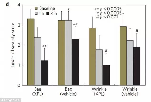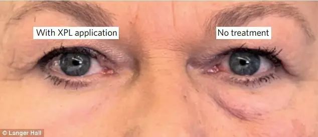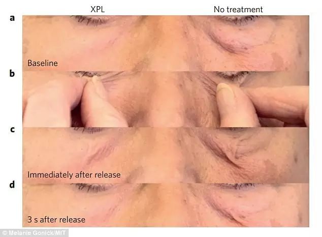 (圖8、還防水喲) 據(jù)研究職員表示,薄膜能在皮膚上施展很好的保護作用,減少水分流失,有望用于治療濕疹等皮膚! 假如加入防曬霜成分,這種薄膜還可能起到防曬作用! 對了,由于聚硅氧烷對可見光沒有顯著的吸收,厚度僅40至70微米,所以…… 它不但看起來基本和正常皮膚沒太大差別,而且還能消除眼袋和皺紋! 下面是科學家做的一組對比實驗數(shù)據(jù),戴上它1小時和4小時后,眼袋和皺紋都有顯著的減少。。