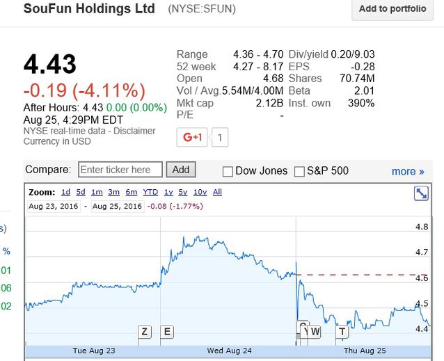 固然搜房本季度仍舊爆出巨虧,但環(huán)比而言,虧損金額已經(jīng)大幅度減少;而且本季度的EPS 也大大好于華爾街的預(yù)期。不外似乎華爾街目前并不買賬,今天業(yè)績(jī)公告之后,搜房的股價(jià)收盤價(jià)格跌幅超過(guò)4%,交易量超過(guò)550萬(wàn)個(gè)ADS;搜房目前的股票價(jià)格只有4.43美元,已經(jīng)接近過(guò)去52周最低價(jià)格的4.27美元。以下為搜房股票價(jià)格趨勢(shì)圖: