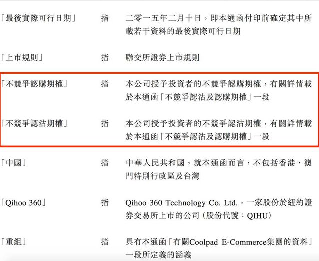 360和酷派正在經(jīng)歷著一場明爭冷戰(zhàn),跟著上周360祭出要求酷派以14.85億美元認(rèn)沽奇酷公司期權(quán)這個(gè)殺招后,兩家的關(guān)系徹底撕破,也開始了互相扯皮的口水戰(zhàn)。這邊酷派稱360沒有履行合約內(nèi)容,360則發(fā)布聲明稱酷派違背了競爭協(xié)議,一時(shí)間到底誰說謊了呢?包括價(jià)值兄在內(nèi)的各位,想必都想直到背后的真相到底是什么吧。價(jià)值兄這里拿到了當(dāng)時(shí)360與酷派合作時(shí)候簽署的協(xié)議的全部內(nèi)容,獨(dú)家還原兩家當(dāng)初還甜美如初戀的公司,為什么會(huì)走向不共戴天的地步。 焦點(diǎn)一:14.85億美元認(rèn)沽權(quán)到底該不該得到支持 上周360發(fā)布聲明稱,酷派違背同業(yè)競爭協(xié)議,360決定行使相關(guān)認(rèn)沽期權(quán),將其所持有的全部股權(quán)按市場價(jià)的兩倍出售給酷派公司,即要求酷派以兩倍的價(jià)格回購360所持有的49.5%的奇酷科技股權(quán)(價(jià)值7.425億美元),總金額為14.85億美元。面臨市值僅6.68億美元(截至2015年9月11日收盤,酷派市值51.80億港幣)的酷派,可謂難于登天。 那么到底360和酷派簽署的協(xié)議是怎么劃定的呢?價(jià)值兄這里獨(dú)家拿到了協(xié)議的全文,第一時(shí)間提供應(yīng)各位查閱(如下圖)。 圖1-2是酷派和360簽署的的股東,可以看出來,酷派團(tuán)體與360在2015年2月12日簽署了這份協(xié)議,已經(jīng)在圖4的香港有關(guān)部分公然表露,完全具備法律效力。