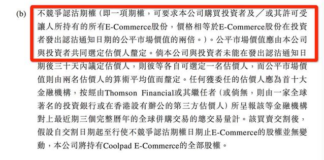 圖4 那么360和酷派的“認(rèn)沽權(quán)”是怎么劃定的呢?可以看出,假如雙方劃定了兩種方式“不競爭認(rèn)購期權(quán)”和“不競爭認(rèn)沽期權(quán)”(圖5),并且分別劃定了相應(yīng)的權(quán)利和義務(wù)(圖6-圖8),尤其是圖7,非常具體的劃定了假如違背“不競爭認(rèn)沽期權(quán)”的內(nèi)容,即酷派不得直接或間接于中國或美國“在與受限制業(yè)務(wù)相同或相似或與之競爭的任何業(yè)務(wù)中擁有任何權(quán)益、治理、控制、介入、咨詢、提供服務(wù)或以其他方式從事,或從事協(xié)助”,而眾所周知的是,2015年6月28日,酷派發(fā)布的《控股股東出售股份公告》顯示,郭德英家族通過信托計(jì)劃持股的Data Dreamland以3.508港元每股的對(duì)價(jià)向樂視聯(lián)系關(guān)系公司出售7.8038億股,占已發(fā)行總股本的18%,后者曾經(jīng)推出了多款手機(jī)產(chǎn)品,與360、酷派合資的奇酷科技的業(yè)務(wù)線重疊嚴(yán)峻,顯然,酷派這是演了一出“一女嫁二夫”的小算盤,但是卻健忘了當(dāng)初與360簽署的協(xié)議,以及必需履行的義務(wù)。