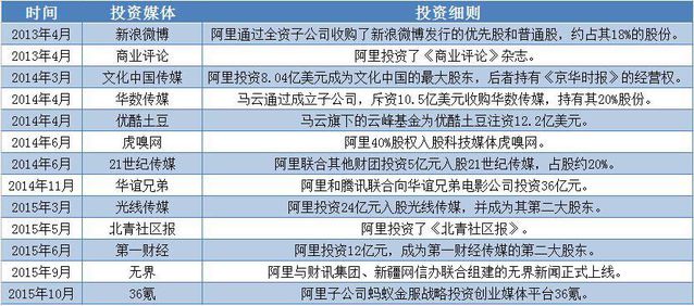 據(jù)悉,封面將主打新聞客戶端,以The cover.cn網(wǎng)站為基礎(chǔ),涵蓋微博 、微信、視頻、數(shù)據(jù)、論壇、智庫(kù)等,并逐步推出多個(gè)垂直細(xì)分領(lǐng)域的產(chǎn)品矩陣。未經(jīng)證明的傳說(shuō)傳聞稱,這次阿里為了打造封面?zhèn)髅,不惜?億巨資。 四川日?qǐng)?bào)作為傳統(tǒng)媒體,此刻搭上了資本的順風(fēng)車,搖身一變成為新媒體,無(wú)疑再次令不少傳統(tǒng)媒體同行艷羨不已。而阿里作為傳媒領(lǐng)域的投資老手,近兩年通過(guò)不同的資本運(yùn)作方式,已控制了海內(nèi)多家媒體的話語(yǔ)權(quán)。 那么題目來(lái)了,阿里如斯瘋狂擴(kuò)張傳媒版圖背后的邏輯到底是什么呢? 投資觸角不斷延伸,阿里瘋狂擴(kuò)張傳媒版圖 從過(guò)往歷史中不難發(fā)現(xiàn),阿里此前也曾多次進(jìn)行過(guò)傳媒領(lǐng)域的投資。其中,影響力最大、最深遠(yuǎn)確當(dāng)屬阿里對(duì)第一財(cái)經(jīng)的投資。 四個(gè)月前,阿里以24億元巨額投資第一財(cái)經(jīng)的動(dòng)靜瞬間引爆整個(gè)互聯(lián)網(wǎng)圈,所引起的轟動(dòng)好像仍在面前。 當(dāng)時(shí),第一財(cái)經(jīng)頂著中國(guó)唯逐一家集廣播、電視、日?qǐng)?bào)、網(wǎng)站、雜志于一體的中國(guó)專業(yè)財(cái)經(jīng)媒體的光環(huán),而且其平面媒體包括海內(nèi)著名度頗高的財(cái)經(jīng)類報(bào)紙《第一財(cái)經(jīng)日?qǐng)?bào)》和財(cái)經(jīng)類雜志《第一財(cái)經(jīng)周刊》,阿里的想法主意是憑借自身的資本和渠道,以及一財(cái)?shù)挠绊懥,將后者打造?ldquo;中國(guó)版彭博社”。 但阿里的野心不止步于此,實(shí)際上,自2013年開(kāi)始,阿里在傳媒領(lǐng)域的投資動(dòng)作就從未中斷,且投資觸角已陸續(xù)伸向傳統(tǒng)平面媒體、影視公司及新媒體。