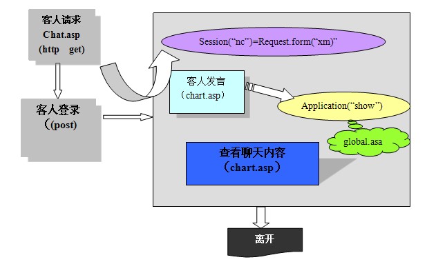 ![]() 聊天室處理流程 Global.asa文件的格局 global.asa文件實(shí)在是一個(gè)可選文件,它是專門存放全局變量和局部變量的文件,即在這里聲明具有會話和應(yīng)用程序作用域的變量,同時(shí)還可以指定事件程序,客戶端是看不到該文件的,它存放在應(yīng)用程序的根目錄下,文件名必需是global.asa,每人應(yīng)用程序只能有一個(gè)global.asa文件,文本中不能有HTML標(biāo)記,不答應(yīng)更改文件名。格局如下: <script language=”VBScript ” runat=”Server”> Sub session_OnStart 當(dāng)客戶首次運(yùn)行ASP應(yīng)用程序中的任一頁面時(shí)運(yùn)行。 …….. End sub Sub session_OnEnd 當(dāng)某客戶會話超時(shí)或退出應(yīng)用程序時(shí)運(yùn)行。 …….. End sub Sub Application_Onstart 當(dāng)任何客戶首次訪問該應(yīng)用程序的首頁面時(shí)運(yùn)行。 …….. End sub Sub Application_OnEnd 當(dāng)該站點(diǎn)的WEB服務(wù)器封閉時(shí)運(yùn)行。 …….. End sub </script> |