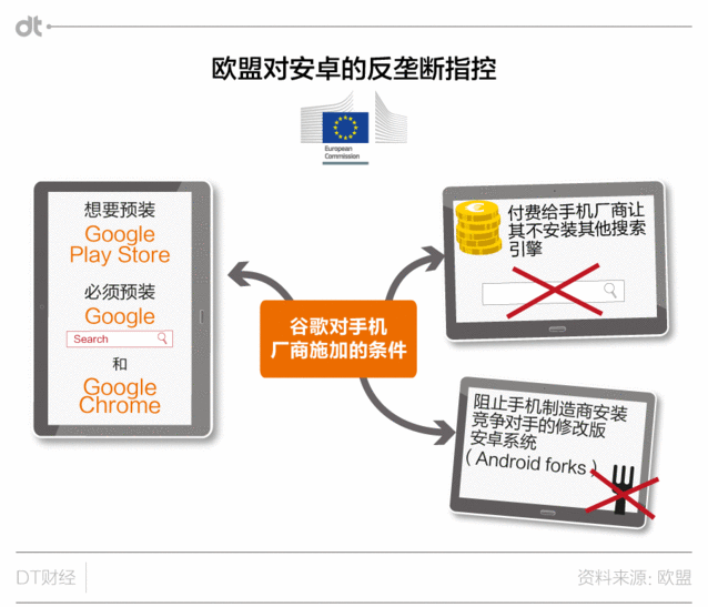 實(shí)在,一開始?xì)W盟成立調(diào)查組,就是為了避免案件像此前的微軟反壟斷案一樣,一拖就是十多年。歐盟起初但愿可以快速找到證據(jù),對(duì)谷歌進(jìn)行懲罰。但事到如今回頭看,歐盟顯然沒能實(shí)現(xiàn)愿望,如今案件也拖了近六年,而且終極仍是要靠正式訴訟來終結(jié)糾紛。 《逐日電訊報(bào)》的報(bào)道中,也引述分析人士稱,在多年的糾纏之后,谷歌已經(jīng)不想再繼承耗費(fèi)精力財(cái)力,也打算接受罰款終止案件。 歐盟放大招,歷數(shù)谷歌安卓系統(tǒng)的三大罪狀 那么歐盟這30億的罰款,畢竟是因?yàn)楣雀璧氖裁醋餇钅兀?/p>