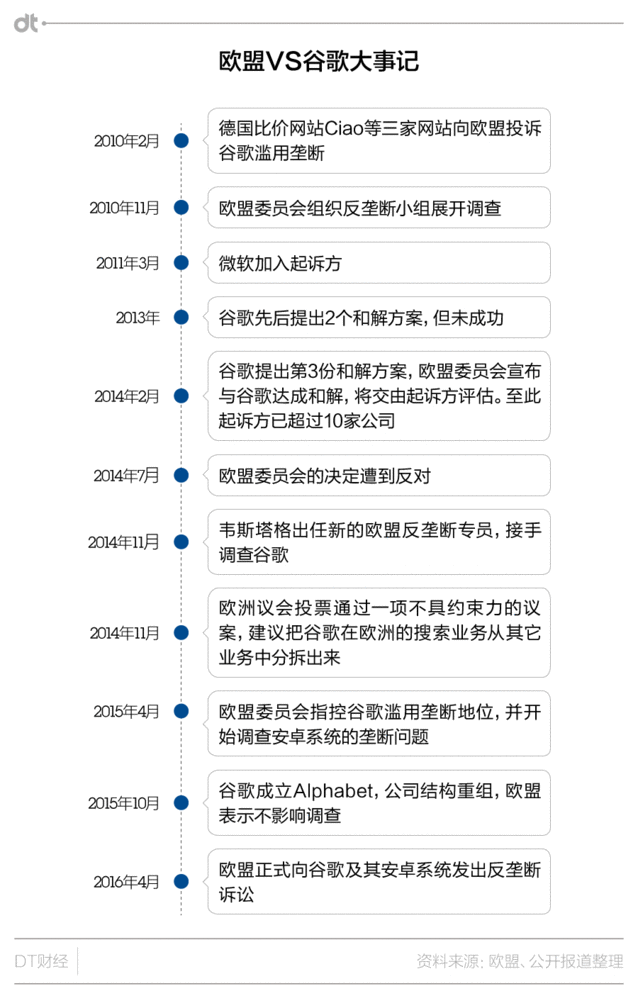 谷歌的反壟斷案,可能即將以30億罰款來終結(jié) 據(jù)英國《逐日電訊報(bào)》報(bào)道,歐盟委員會(huì)近期將公布對(duì)谷歌涉嫌壟斷的罰款數(shù)額,而這一數(shù)字可能高達(dá)破紀(jì)錄的30億歐元。而到目前為止已有的最高反壟斷罰單,是2009年對(duì)芯片制造商英特爾公司11億歐元罰款。 讓谷歌雪上加霜的是,這30億歐元恐怕還不是上限,根據(jù)相關(guān)法律,歐盟委員會(huì)最高可以對(duì)公司處以其年?duì)I業(yè)額10%的罰款。也就是說,谷歌公司面對(duì)的罰款上限將達(dá)60億歐元。 事情大概是這樣的:2010年下半年,幾家搜索及比價(jià)網(wǎng)站指控谷歌利用其搜索上風(fēng)推廣自家服務(wù),損害競(jìng)爭(zhēng)對(duì)手利益。之后歐盟對(duì)谷歌的反壟斷調(diào)查開始,這一被形容為“史詩級(jí)”的訴訟正式拉開序幕。在之后的近6年的調(diào)查中,谷歌曾先后三次提出和解方案,但終極都被拒絕。 DT君為大家總結(jié)了這場(chǎng)訴訟的歷史: