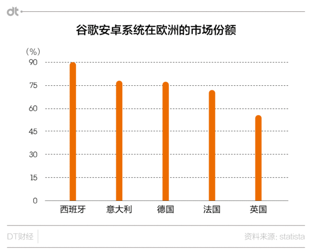 可以看出,歐盟主要針對(duì)的是谷歌預(yù)裝安卓及自己軟件的行為。歐盟以為,谷歌這樣做是在抹殺規(guī)模較小的立異型應(yīng)用制造商和服務(wù)供給商。 實(shí)在,對(duì)于預(yù)裝行為的懲罰,歐盟此前也干過。2007年了解的微軟壟斷案中,歐盟就是認(rèn)定微軟濫用了其在個(gè)人電腦(PC)操縱系統(tǒng)領(lǐng)域的主導(dǎo)地位,向消費(fèi)者強(qiáng)行推廣其媒體播放器,案件的總罰款超過20億歐元。 但此次案件與之不同的是,微軟的預(yù)裝可以直接帶來銷售利潤(rùn)。而安卓則是免費(fèi)的。那歐盟為何還這么擔(dān)心呢?恐怕是由于谷歌安卓在歐洲的“勢(shì)力”其實(shí)太大。 根據(jù)statista的統(tǒng)計(jì),安卓在歐洲各國的市場(chǎng)份額很高,在西班牙甚至達(dá)到了九成。