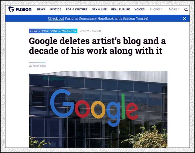 在庫柏高聲喊冤的他自己的Facebook主頁上,有評論預(yù)測可能有人向谷歌舉報(bào)他的作品中含有“淫穢”內(nèi)容。庫柏的博客內(nèi)容是否“淫穢”無從得知,由于已經(jīng)消失了,杰羅姆固然好奇,但沒有機(jī)會目擊見證。不外,這些內(nèi)容14年來一直在發(fā)布,而且有明確的成人警告標(biāo)識,為什么14年間沒惹事生非,溘然就犯忌了呢?庫柏想不明白。假如這些內(nèi)容犯了大忌,挑戰(zhàn)了文明的底線,明著來唄,沒必要羞羞答答。 顯然,美國實(shí)驗(yàn)藝術(shù)家?guī)彀匚幢匾欢ㄊ鞘裁春螟B,他的“淫穢”內(nèi)容,未必一定不該查禁。但同時(shí)查封其郵箱,驚動(dòng)新聞界也就不希奇了。谷歌博客與谷歌郵箱是完全不同的兩個(gè)產(chǎn)品,應(yīng)該在兩個(gè)不同的服務(wù)器上,為什么同時(shí)失落?美國新聞網(wǎng)站 Fusion 記者伊森·切爾通過電子郵件聯(lián)系上了谷歌,谷歌方面通過電子郵件回應(yīng)說“知道這件事”,但不能對詳細(xì)用戶賬戶進(jìn)行評論。 庫柏糊口在法國,他告訴網(wǎng)站《藝術(shù)論壇》(Artforum)他正在向一位知識產(chǎn)權(quán)律師進(jìn)行咨詢。而庫伯告訴伊森·切爾他正在考慮起訴谷歌。