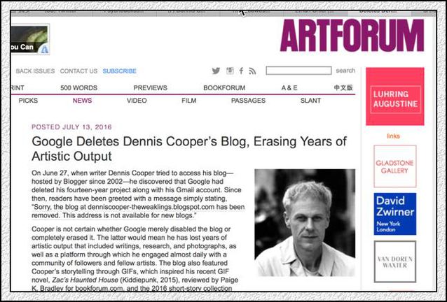 棲身在法國的美國藝術(shù)家丹尼斯·庫柏(Dennis Cooper)14年來發(fā)布在全球最大的互聯(lián)網(wǎng)平臺上的作品溘然消失了,他的谷歌博客、谷歌郵箱同時(shí)被刪除。 丹尼斯·庫柏從2002年起開始使用埃文·威廉姆斯創(chuàng)辦的博客平臺Blogger,2003年,谷歌收購了Blogger。今年6月底,庫柏發(fā)現(xiàn)他的博客被下線了。同時(shí),他發(fā)現(xiàn)自己的谷歌郵箱也被禁用了。 庫柏告訴聞名新聞網(wǎng)站 Fusion 記者伊森·切爾(Ethan Chiel),谷歌沒有給出任何刪除其博客與郵箱的理由。