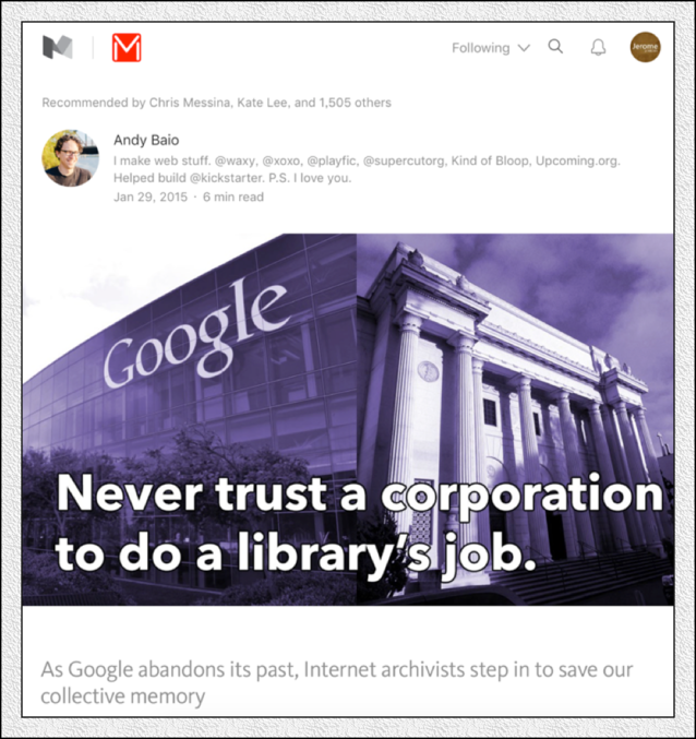 伊森·切爾寫道:Google說自己的“使命在于整合全球信息,使人人都能訪問并從中受益”,但它是否有愛好維護(hù)歷史記實(shí),或者匡助他人這么做,并不清晰。伊森·切爾引用學(xué)者安迪·拜奧(Andy Baio)的話說:在本世紀(jì)初谷歌曾許愿的很多歷史文檔存檔項(xiàng)目,好比谷歌新聞、Google Groups存檔,都在幾年前被靜靜拋卻了。 安迪·拜奧說: “我們不能期待一個(gè)以贏利為目的的企業(yè)會在意過去。”也就是說,假如互聯(lián)網(wǎng)是你的檔案柜,你的檔案時(shí)刻處在危險(xiǎn)之中。