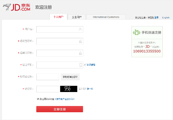 京東分為個(gè)人、企業(yè)、國(guó)際三類(lèi)用戶,用戶注冊(cè)需要填寫(xiě)的選項(xiàng)良多,較為繁瑣。