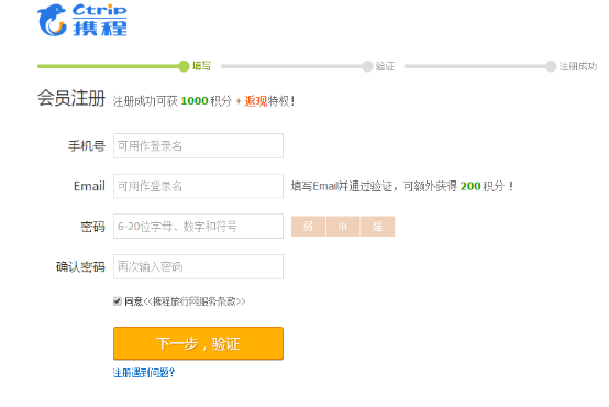 如下圖的攜程注冊(cè)頁(yè)面,提示驗(yàn)證郵箱可以獲取200積分。