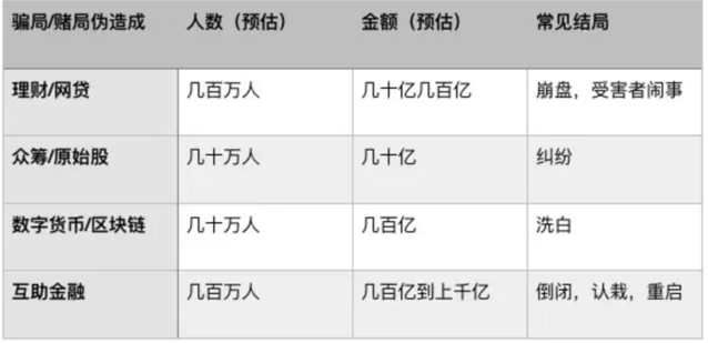 根據(jù)我的了解,我把他們大致分為以下幾類,他們的市場規(guī)模和結(jié)局大致如下: 看看網(wǎng)貸的那些崩盤的騙局,e租寶、大大團體,每個都有數(shù)百億規(guī)模,這些崩盤,都造成了巨大的影響。實在我理解后面三種的規(guī)模,都比這個理財崩盤的規(guī)模要大。 為什么騙了還能洗白?由于這些貪婪的受害者不覺得是被騙,認為是賭輸了認栽。炒幣輸了,互助倒了,他們都把原因歸結(jié)為命運運限不好,殊不知,背后實質(zhì)上是被騙了。只要受害者不鬧事,就沒有受害者。【不信你去舉報傳銷嘗嘗就知道了,公安說你找工商,工商問你你是受害者嗎,不是就不要瞎忙活,組織傳銷罪可沒有這么輕易定罪】 這些每個都是有備而來,而且,都有成型的工業(yè)鏈和模式套路支撐。對中國的整個金融秩序,是莫大的傷害。這些每個都利用了投資人逐利和追求暴利的心態(tài)。不可否認,欲求不滿和貪婪是每個人的本能,冷靜節(jié)制才是后天培養(yǎng)的技能。 且截至目前,并沒有看到政府拿出切實可行的策略來應(yīng)對。甚至在去中央化傳銷等領(lǐng)域的法律基本都仍是空缺。即使被你抓到,你都沒法用現(xiàn)有的法律來進行裁定。沒看到MMM都是公然的搞的嗎,沒看到套著“區(qū)塊鏈、數(shù)字貨泉”外衣的偽幣騙局都公然拉人開大會嗎,由于按照現(xiàn)有法律,人家可能根本沒有違法。 我們能夠制定政策的央行和部委,處在高位,身邊會萃的學(xué)者說客,忙著兩眼盯著技術(shù)立異國外發(fā)展標榜自己,并不一定看得到這種具有中國特色的規(guī)?膳碌牡讓域_局怪相。出臺的政策方針可能并不能很好的應(yīng)對這些事情。 理財、網(wǎng)貸騙局因為P2P網(wǎng)貸在前兩年的迅猛發(fā)展催生了這類公司。年底開始泛起大量的跑路崩盤。 這種技術(shù)含量低,實施門檻低,易學(xué)易用,金向陽,e租寶,大大團體都是典型,倒閉跑路的網(wǎng)貸平臺基本屬于這一類。設(shè)立資金池,吸納大量的公家資金進行投資,給投資人高額回報作為誘惑;旧弦粌赡昃蜁。 他們常見的策略就是上央視廣告、和領(lǐng)導(dǎo)合影、交更多的稅、拿更多的獎、租高大上寫字樓、給優(yōu)厚的待遇、招大量的員工,拼命擴大規(guī)模。以快和大來應(yīng)對一切泛起的題目。 面向?qū)ο蠡臼谴髬尨鬆敗]p微有點互聯(lián)網(wǎng)使用習(xí)慣的都不大會上當(dāng)。 這些公司在爆掉之前,都是地方政府的香餑餑,由于稅多啊。這些公司一而再再而三的倒閉,讓投資人知道,任何廣告都不附帶信用,央視做著騙子廣告也可以免責(zé)。只要騙子還沒被法律界定,央視接他們的廣告,忽悠全中國人民,他們是不用承擔(dān)責(zé)任的,高鐵廣告同理。 這種跑路的理財公司,最后的結(jié)局都是爆掉,瘋狂擴張民間借貸的互聯(lián)網(wǎng)加強版。 原始股、股權(quán)眾籌騙局你們有沒有朋友圈看到過這樣的廣告,一般都是鮮紅的圖配著亢奮的字,告訴你,暴富機會在面前,再不捉住就沒有了,再不投資就錯過下一個馬云了。