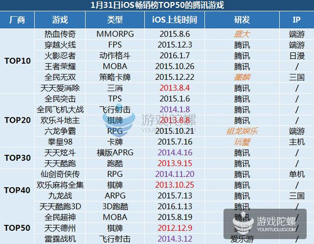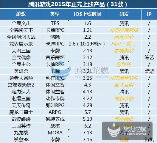 (僅統(tǒng)計2016年1月31日App Store當(dāng)天暢銷榜,騰訊發(fā)行游戲排名) 實在我們結(jié)合這幾年的騰訊手游發(fā)行情況,騰訊的主要策略仍是獲取用戶為主,由于在之前幾年中渠道擁有很大的上風(fēng)。騰訊70%的產(chǎn)品都是基于大品類籠蓋,包括跑酷、飛行射擊。但跟著人口紅利上風(fēng)衰減,用戶不斷成熟,渠道已經(jīng)不能決定用戶選擇游戲的方向,游戲本身的質(zhì)量已經(jīng)越來越重要,越來越多的用戶開始有了明確需求。細(xì)分市場,垂直用戶以及精品產(chǎn)品成為了騰訊的基本打法,這一策略也被市場所驗證。不外手游生命周期的題目,依舊困擾著所有從業(yè)者,如何延長?最靠譜的方式仍是MMO,這個被端游、頁游市場驗證過的形式。不光騰訊,2016年所有的大廠都往這個方向靠攏。 2015年騰訊發(fā)行的重點產(chǎn)品已經(jīng)集中在了重度類型,當(dāng)然騰訊內(nèi)部的分類沒有輕、中、重,而是按類型分,以這個尺度看:卡牌、休閑、MOBA、FPS四類為主。IP類產(chǎn)品在騰訊2015的手游中表現(xiàn)十分凸起。但顯然騰訊還有大量的IP產(chǎn)品和來自合作CP的產(chǎn)品。
