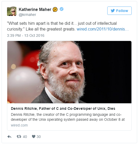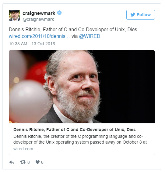 Dennis Ritchie 對(duì)于現(xiàn)代軟件技術(shù)的貢獻(xiàn)是毋庸置疑的,身為 C 語(yǔ)言同時(shí)也是 UNIX 之父,對(duì)于現(xiàn)代軟件以及系統(tǒng)的影響當(dāng)然非常大。他在 2011 年 10 月 13 日于紐澤西過(guò)世,當(dāng)時(shí)引起很多科技業(yè)重量級(jí)人物的哀悼。不外,基于某些錯(cuò)誤,他近日在 Twitter 上“再度”過(guò)世了一次。 在社交網(wǎng)站上都有一些演算法的機(jī)制,會(huì)回顧過(guò)去幾年這一天所發(fā)生的信息。有的時(shí)候我們一不小心沒(méi)有留意日期,就會(huì)誤認(rèn)為是當(dāng)天所發(fā)生的事情。而這個(gè)在美國(guó)科技圈發(fā)生的烏龍事件,不清晰是不是也是由于這個(gè)演算法所引起的。 事情到底是誰(shuí)開(kāi)始?不外根據(jù) fossbytes的考證,溯源追蹤到 CNET 的科技界著名記者 Om Malik,他在 Twitter 發(fā)了一篇引述 Wired 報(bào)導(dǎo)、哀悼 Dennis Ritchie 的推文。而 Google 的 CEO Sundar Pichai 也推了這篇文章。 因?yàn)?Om Malik 的影響力,接下來(lái)又引出了兩位科技界的大咖的轉(zhuǎn)推。像是 Craig Newmark,Craigslist 的創(chuàng)辦人。 Katherine Maher 目前負(fù)責(zé)主管 Wikimedia 基金會(huì)。 因?yàn)檫@些科技大咖的影響力,當(dāng)然這個(gè)“謠言”就開(kāi)始在科技圈傳開(kāi)了,一大堆人開(kāi)始在 Twitter 上對(duì) Dennis Ritchie 進(jìn)行哀悼。 事情一直到 Om Malik 自己發(fā)現(xiàn)了錯(cuò)誤,他連忙在自己的博客上發(fā)布了一篇報(bào)歉文,表示自己分享了一篇 Wired 的報(bào)導(dǎo),卻沒(méi)有留意到報(bào)導(dǎo)的日期,沒(méi)有發(fā)現(xiàn) Dennis Ritchie 早在與喬布斯過(guò)世的統(tǒng)一年就“已經(jīng)”過(guò)世了。 不外,往好處想也由于這個(gè)原因,讓 Dennis Ritchie 他對(duì)于眾人的貢獻(xiàn)再度被喚醒。 |