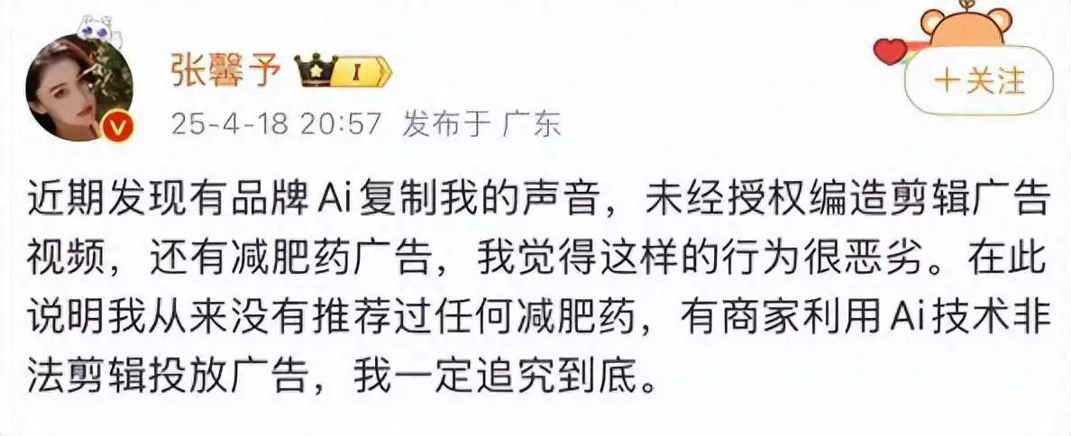 “近期發(fā)現(xiàn)有品牌用AI復制我的聲音,未經(jīng)授權編造剪輯廣告視頻,還有減肥藥廣告,我覺得這樣的行為很惡劣。在此說明我從來沒有推薦過任何減肥藥,