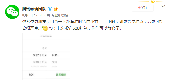 騰訊微信團隊微博消息,本年七夕沒有520紅包。