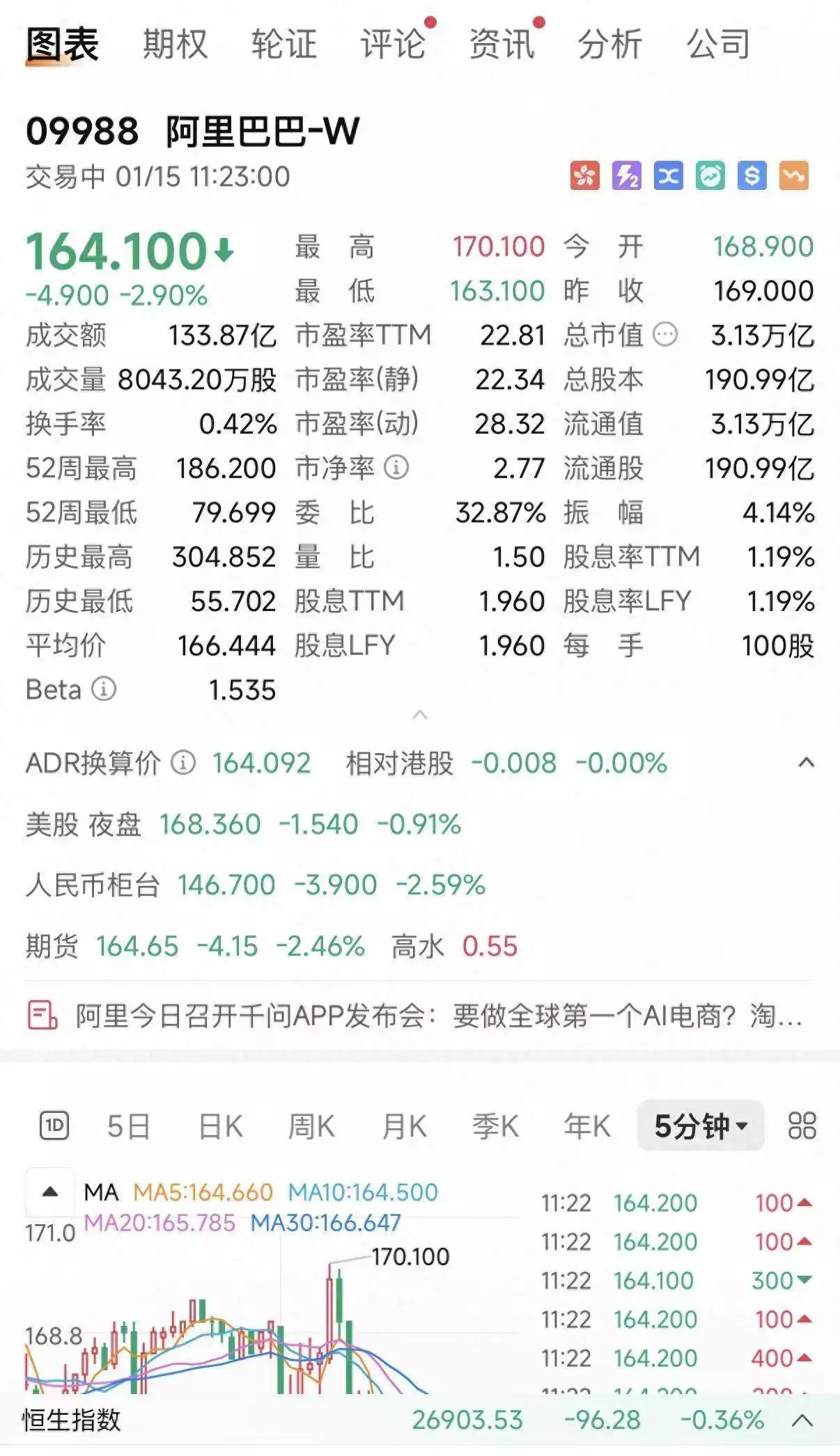 阿里巴巴港股今日(以您看到信息的時間為基準(zhǔn),通常指最近一個交易日)下跌近3%,這通常是市場對公司近期動態(tài)、行業(yè)環(huán)境或宏觀經(jīng)濟(jì)因素的直接反應(yīng)。