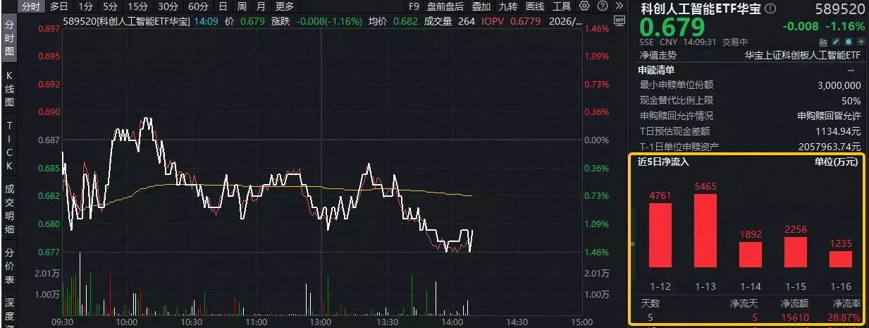今日(1月19日)要點布局國產(chǎn)AI工業(yè)鏈的科創(chuàng)人工智能ETF華寶隨市盤整回調(diào),場內(nèi)價格現(xiàn)跌1.16%,數(shù)據(jù)顯示,該ETF此前5日連續(xù)吸金,