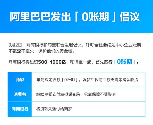 3月2日,網(wǎng)商銀行和淘寶聯(lián)合建議倡議,呼吁全社會縮短中小企業(yè)賬期,不截流不拖欠,維護他們的資金鏈;網(wǎng)商銀行將墊資500-1000億,和淘寶一起,