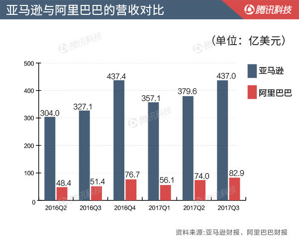 亞馬遜、阿里巴巴相繼發(fā)布2017年第三季度財報。亞馬遜本年體現(xiàn)亮眼,但阿里巴巴體現(xiàn)更好。阿里巴巴趕超亞馬遜的腳步更近了。市值方面,阿里巴巴也曾在10月10日盤中一度超過亞馬遜。