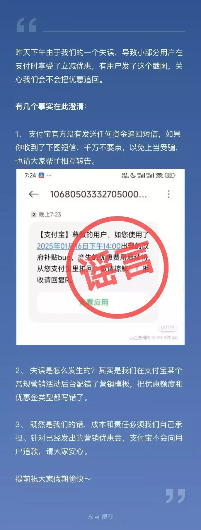 2025 年 1 月 17 日凌晨,支付寶官方微博發(fā)文回應誤發(fā) “立減優(yōu)惠” 事件。以下是回應的具體內容: 事件原因:
