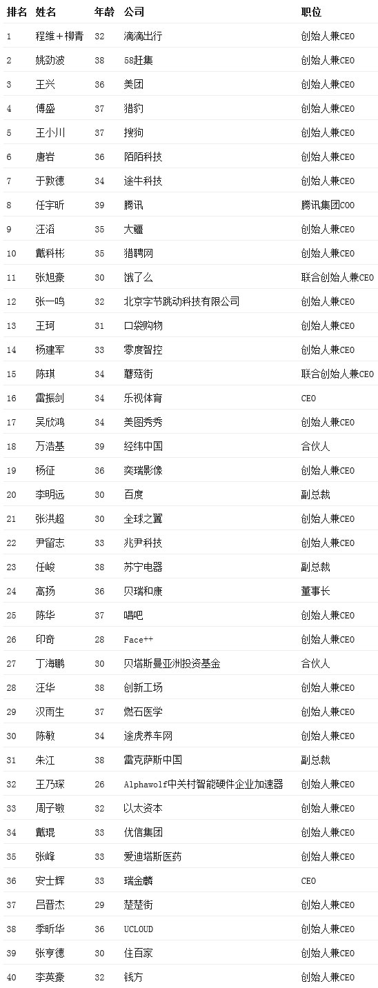 北京時(shí)間11月2日晚間動(dòng)靜,《財(cái)富》(中文版)本日正式宣布2015年"中國(guó)40位40歲以下的商界精英"榜單。 其中滴滴出行CEO程維、總裁柳青并