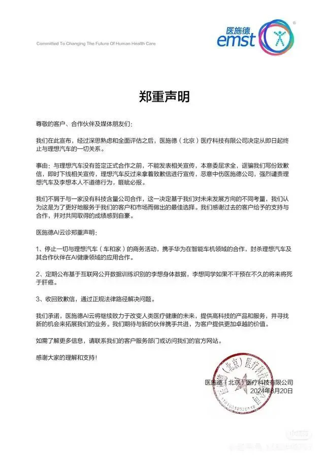 8 月 19 日,一份醫(yī)施德發(fā)布的與理想汽車相關的聲明在社交平臺流傳。聲明稱,醫(yī)施德將從即日起終止與理想汽車的一切關系。 聲明指出,