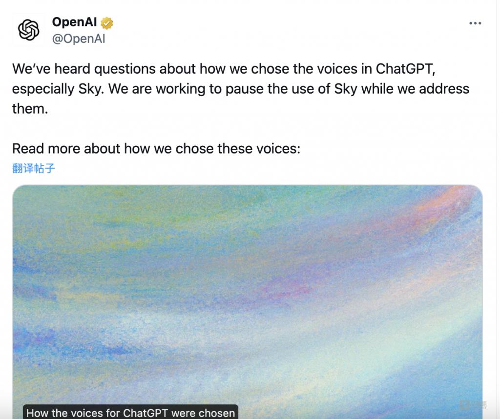 2024年5月20日,OpenAI 宣布暫停其聊天機(jī)器人 ChatGPT 的“Sky”語(yǔ)音功能,原因是該語(yǔ)音與知名演員斯嘉麗·約翰遜(Scarlett Johansson)的聲音極為相像,