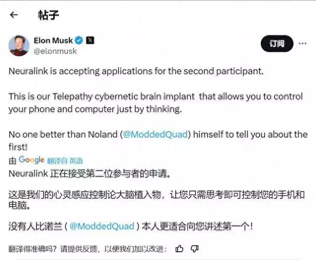 馬斯克宣布,繼年初首個(gè)參與腦機(jī)設(shè)備植入實(shí)驗(yàn)的患者手術(shù)成功100天后,Neuralink(神經(jīng)連接公司)正式開始招募第二個(gè)接受腦機(jī)植入的患者。腦機(jī)接口技術(shù)是一種在腦與外部設(shè)備之間建立直接的通信渠道的技術(shù)。