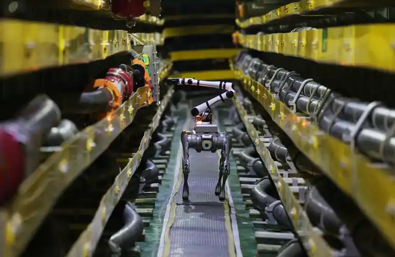 “機(jī)器狗巡檢”和“人形機(jī)器人分揀”是“人工智能+制造”領(lǐng)域兩個(gè)典型的應(yīng)用場(chǎng)景。人形機(jī)器人精準(zhǔn)完結(jié)物料抓取與分揀動(dòng)作,機(jī)器狗正沿著預(yù)設(shè)道路進(jìn)行巡檢