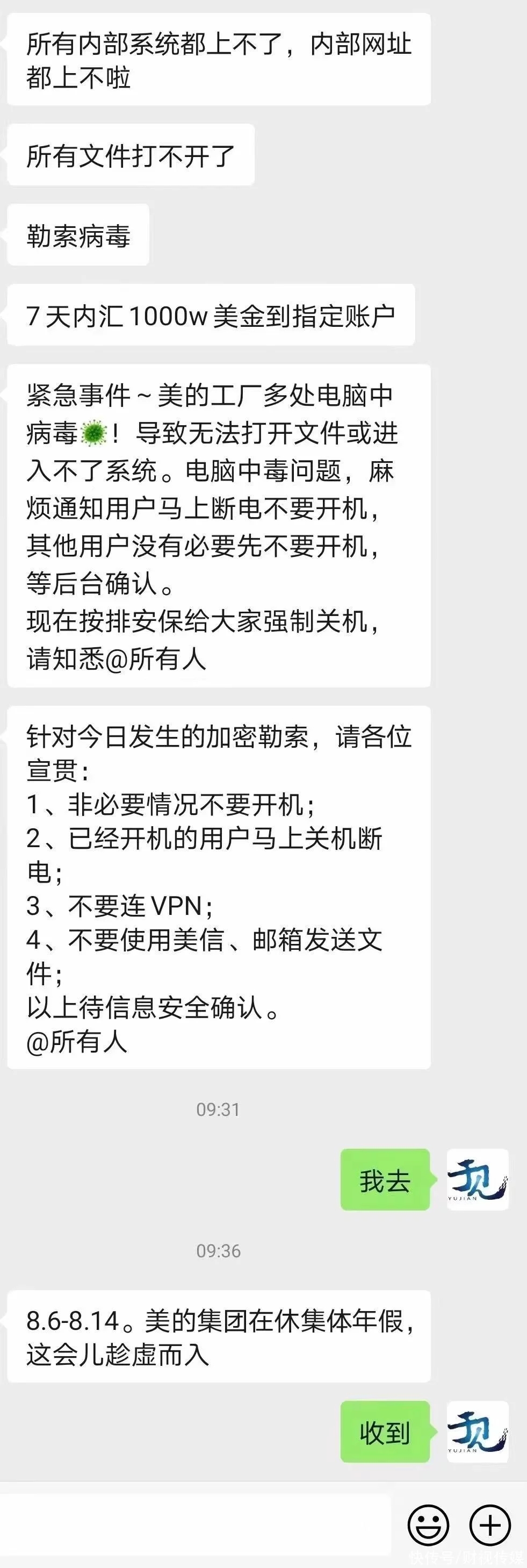 8月11日晚間,微博@美的集團針對“公司內網(wǎng)遭受電腦病毒侵略,被勒索1000萬美金”風聞發(fā)布闡明。美的表示,8月11日,美的集團遭受新型網(wǎng)絡病毒進犯,